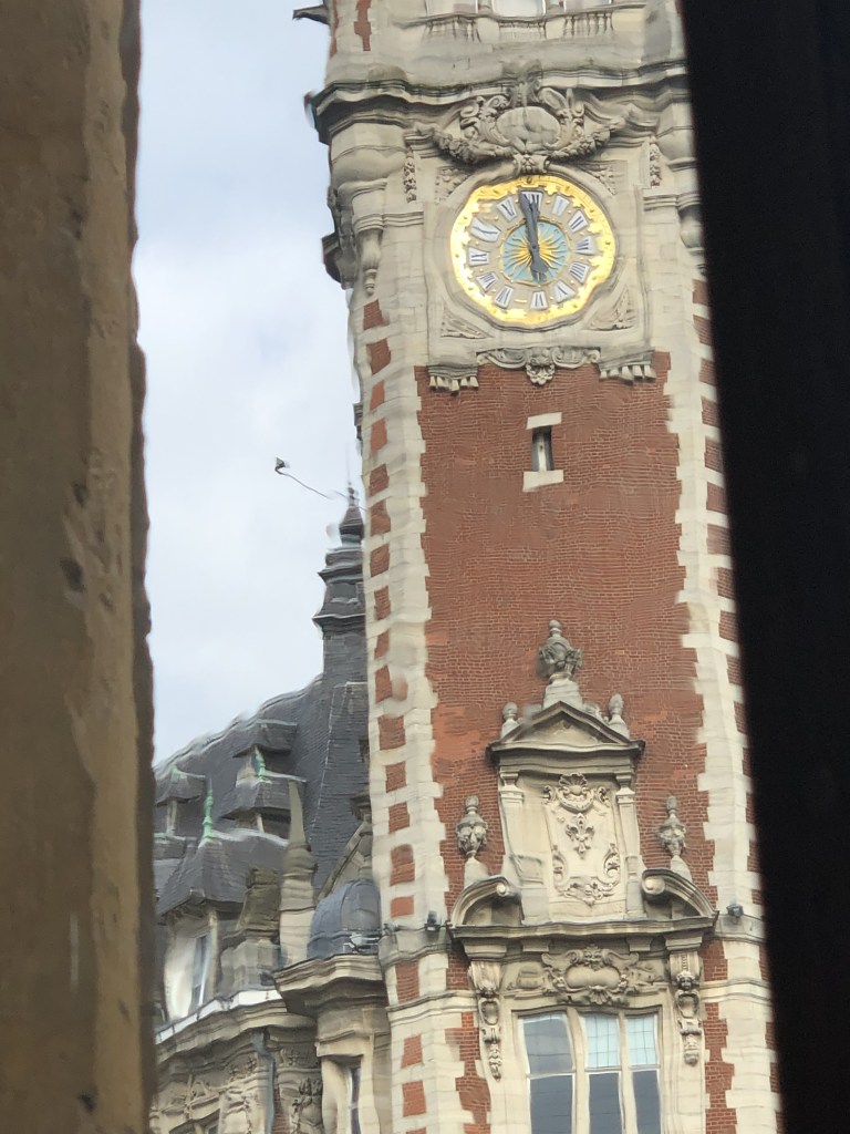 Lillois (or are they tourists?) enjoying Lille on a rainy day. In the background, l’Opéra.The clock tower seen through a rain-streaked café window.
