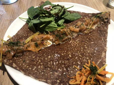 We also had a lunch featuring galettes, which is a kind of thin buckwheat crépe (apparently Breton, not Flemish), in this case garnished with smoked salmon and filled with a hummus spread. It was delicious!