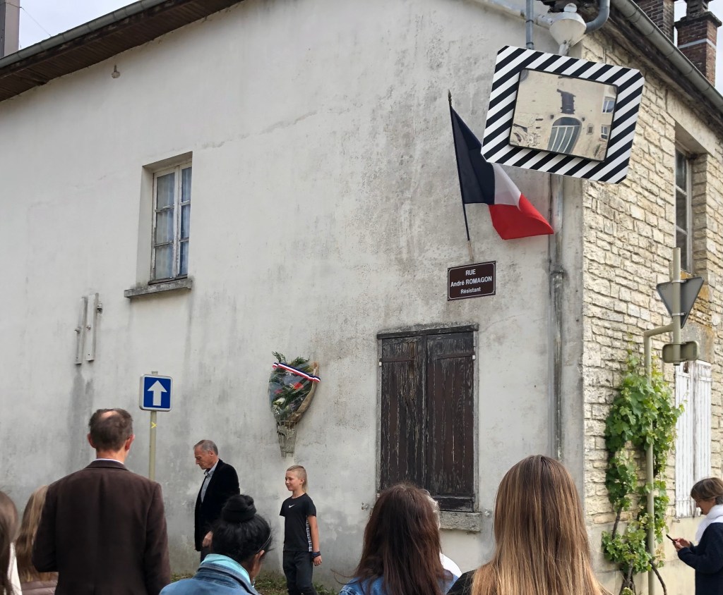 After that we all proceeded to the monument aux morts, and from there to two streets in the village named in honor of André Romagon and Maurice Forgeot, local résistants who were murdered by the Gestapo. In each of these places a minute of silence was observed, and flowers were left.