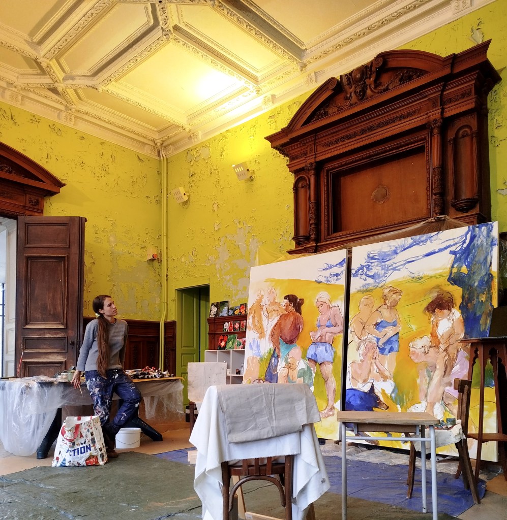 Sidonie Bilger est la lauréate 2025 de la Bourse Renoir, parrainée par l’Association Renoir en partenariat avec la Mairie d’Essoyes (Aube) et le site culturel Du Côté des Renoir. Elle a étudié le dessin, la peinture et la gravure à l’École Emile Cohl á Lyon et à la Hochschule der Bildenden Künst Saar en Allemagne, et elle est diplômée de l’École Nationale Supérieure des Beaux-Arts de Paris. Ses œuvres les plus récentes seront exposées au Manoir Champagne Devaux à Bar-sur-Seine du 3 octobre-1 novembre; puis à la Salle d’Exposition du Crédit Agricole à Troyes (269 Rue du Faubourg Croncels, 10000 Troyes) le 5 -25 novembre. J’ai récemment rencontré Sidonie lors d’une journée portes ouvertes au Château Hériot à Essoyes, où elle travaille sur ses dernières peintures, et elle a gentiment accepté de répondre à quelques questions sur sa vie d’artiste et son travail. Cette interview a été réalisée (principalement) par e-mail, en français et en anglais.
