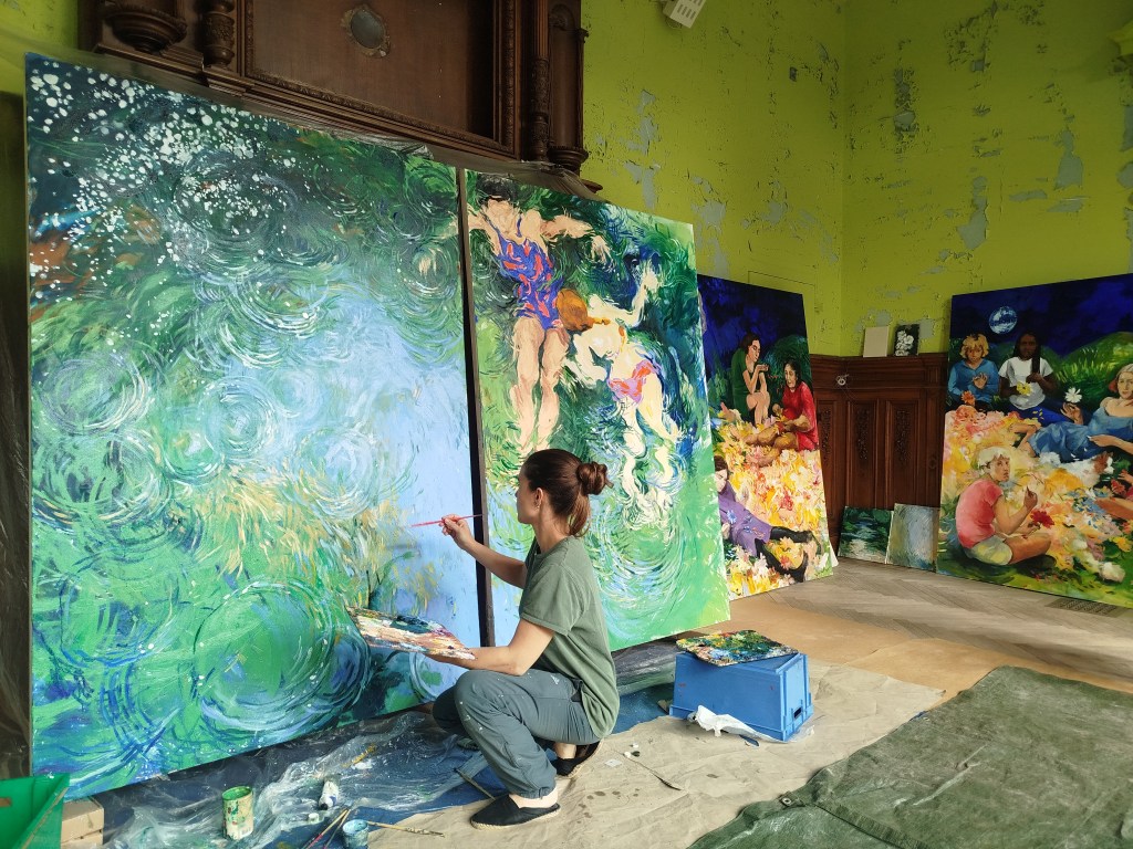 Je suis arrivée à Essoyes le 3 août 2025. L’architecture calcaire et les paysages me rappelaient un peu la Haute-Marne, où j’ai vécu un temps et dont j’ai beaucoup peint les paysages. Mais j’ai été particulièrement fascinée, dans ce village, par la présence de l’eau, cette rivière qui coupe le village en deux. Ensuite, le village m’a touchée dans son initiative autour de la culture. Peu d’habitants y vivent mais j’y ai rencontré un vrai engouement pour la peinture.