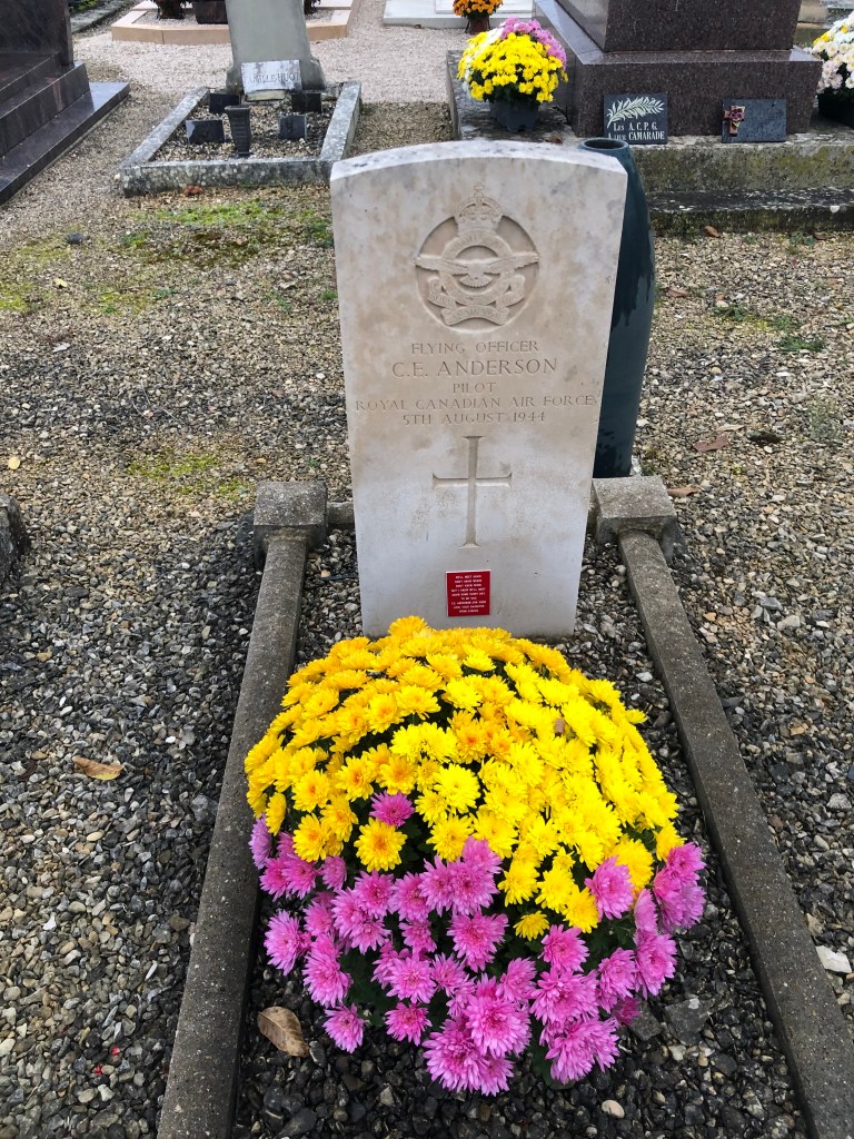 Today I placed fresh flowers on the grave of Flying Officer Charles E. Anderson of the Royal Canadian Air Force, who is buried in the village cemetery in Essoyes.
