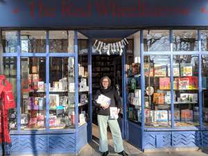Penelope Fletcher, bookseller extraordinaire, in front of the Red Wheelbarrow bookstore, 9 rue de Medicis, Paris. (Right across the street from the Luxembourg Gardens.)
