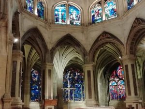This time I was in Paris with a group of American students who were studying French at the Institute Catholique. Among the things we did together were a walking tour with the wonderful Edith de Belleville and a concert at La Sainte Chapelle–on the hottest day in Parisian history as it turned out. Nevertheless, it was a wonderful performance; and by the time the concert was over, the weather had broken and there was a lovely cloud cover over the gates of the St. Chapelle as we headed home. I walked back to the Left Bank over the Pont St. Michel, with its lovely view of the Seine: to the west the Eiffel Tower, to the east the damaged but still standing Notre Dame Cathedral. (Thanks be to God, and to those courageous Parisian pompiers, who fought through the night and risked their lives to save it!)