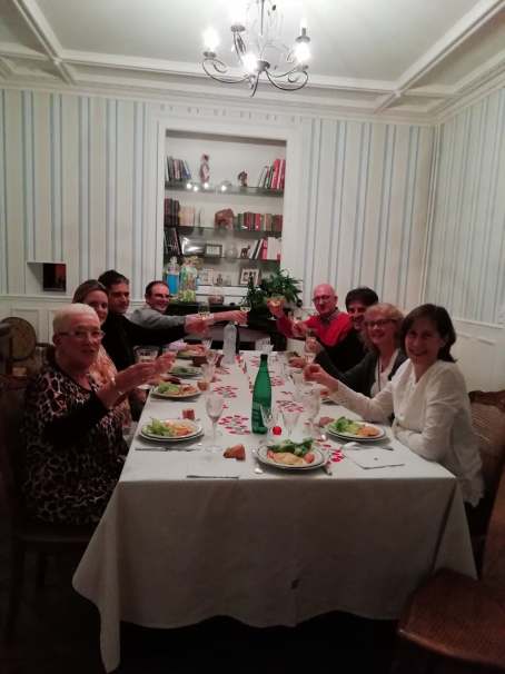 Thanksgiving feast hosted by French friends, featuring wild boar.