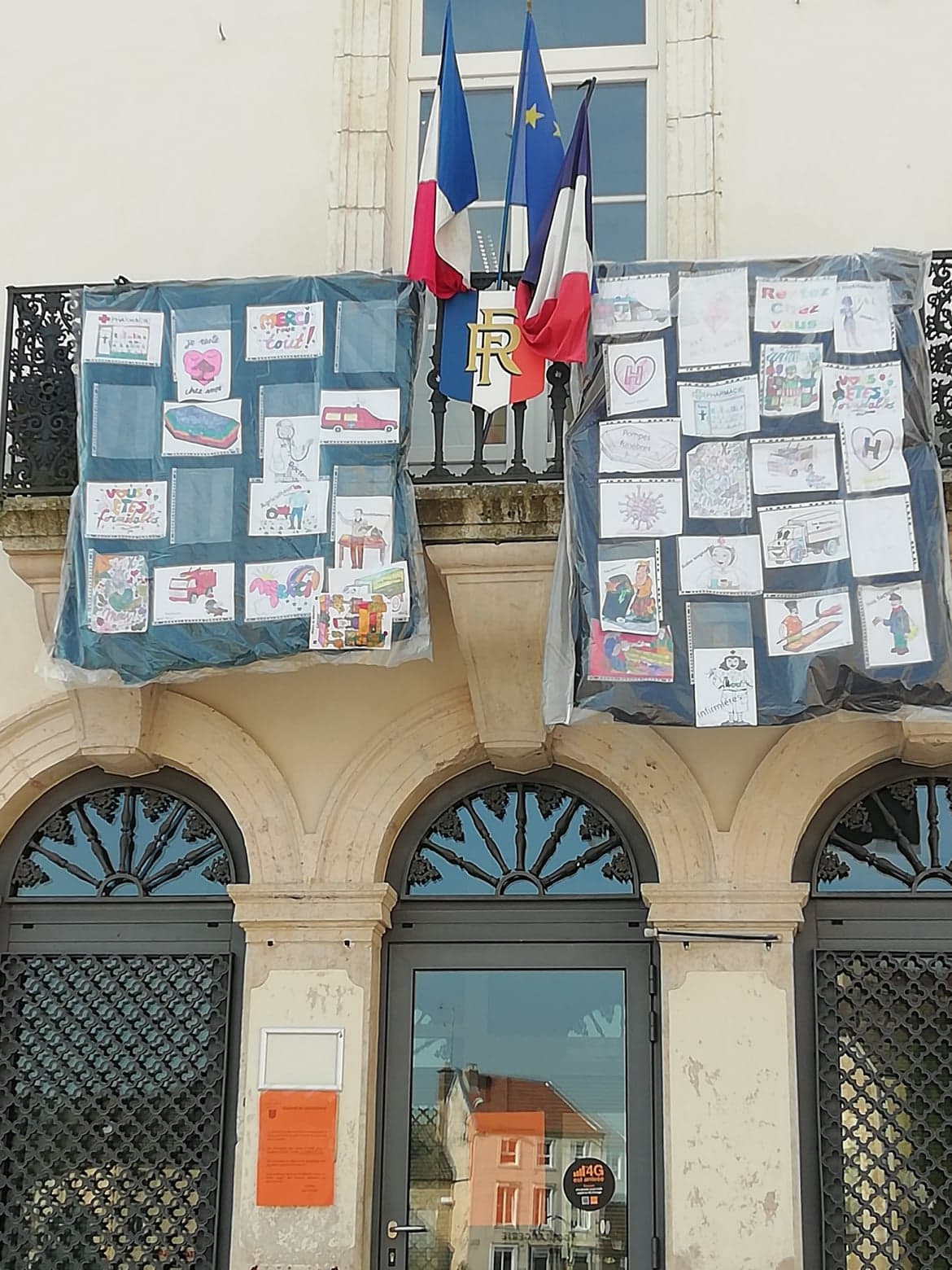 The mairie and some of the businesses in the village are displaying artwork celebrating “nos heroes quotidiennes” created by the children of the village…