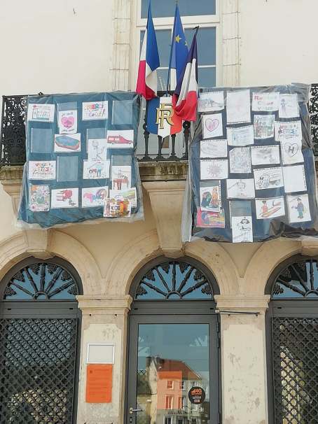 Crayons and line drawings were distributed to the children of the village the week before last, and last week the resulting artwork was displayed around town in the windows and on the walls of the businesses that remain open, and at the mairie. A nice (and appropriately educational) activity for the children, and a cheering sight indeed for all.