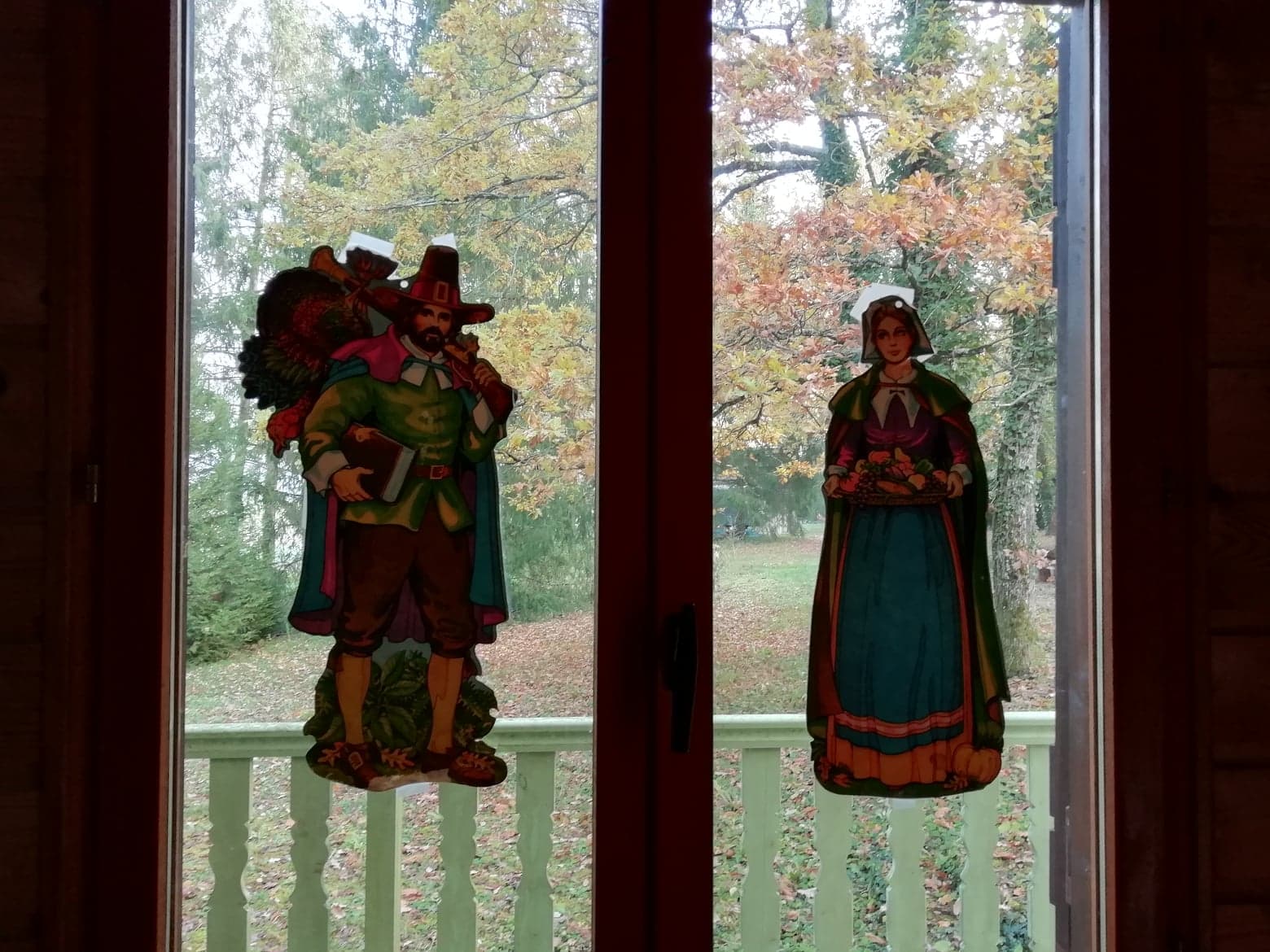 We can put up the decorations that cheer us (like my silly cardboard Pilgrims shown above, one of my Thanksgiving traditions).