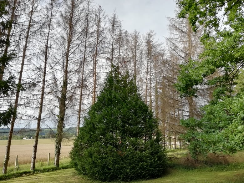 We were most impressed (plus relieved) to watch this team practice their expertise. Five (out of the 32 very tall trees that had to come down) were right next to our house, with a fence behind them, and a road on the other side of the fence, plus a farmer’s field. These guys–two guys, one with a ladder and a chain saw, the other standing at a distance with a rope attached to the tree–managed to take these huge trees down, one at a time, in such a way that when they came crashing down, they cleared the house by a very narrow margin, and also managed to not hit my beloved “Christmas tree”–a beautiful, majestic cedar, which is (thankfully) immune to the insects that have devastated all the spruces. This task was carried out with surgical precision. It was amazing!