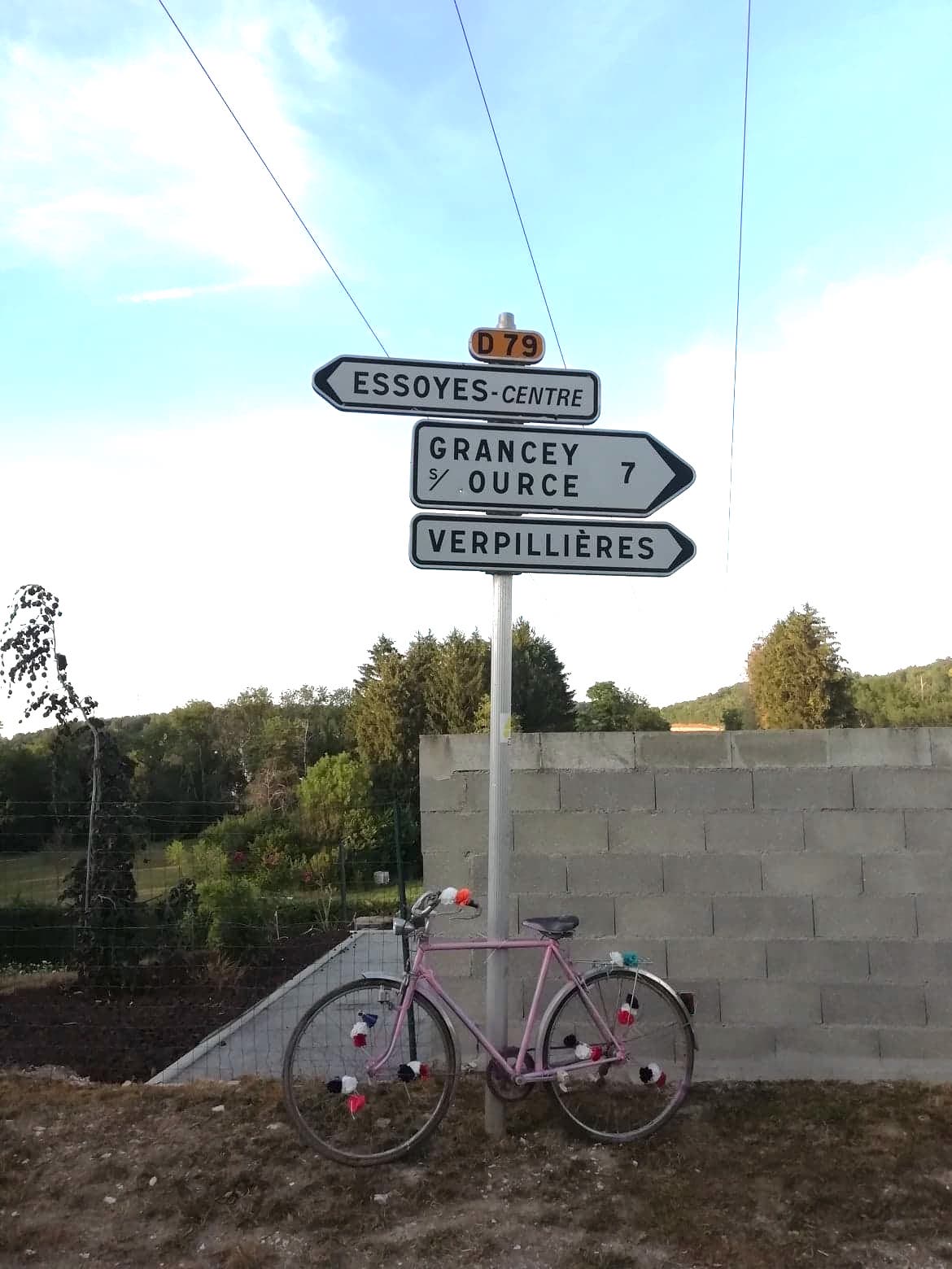 In Essoyes, pink bicycles beautifully decorated with handmade crepe paper flowers, and crepe paper flowers gracing the grillwork and the bridges over the Ource River, helped point the way for the cyclists to make their several turns through town.