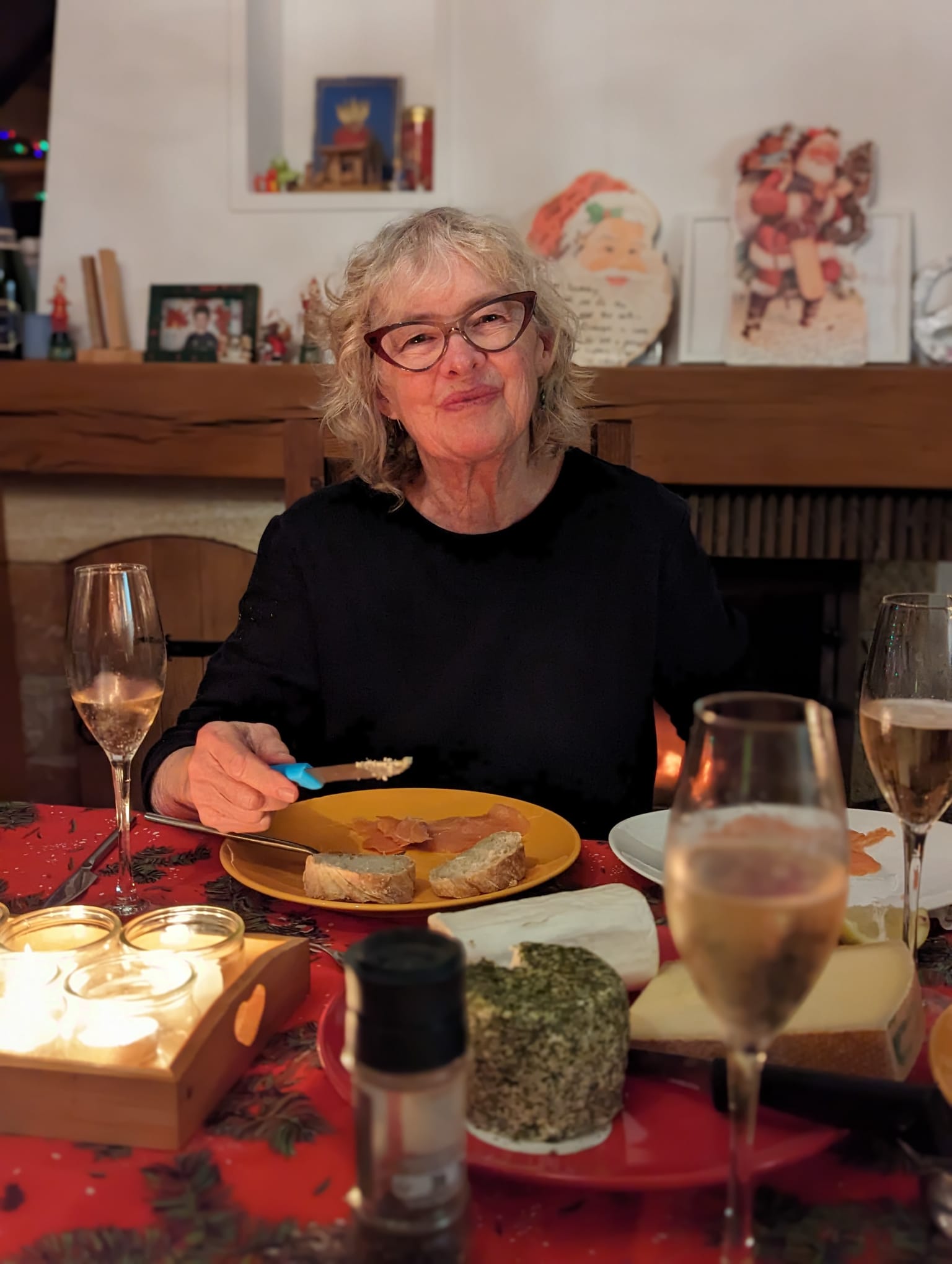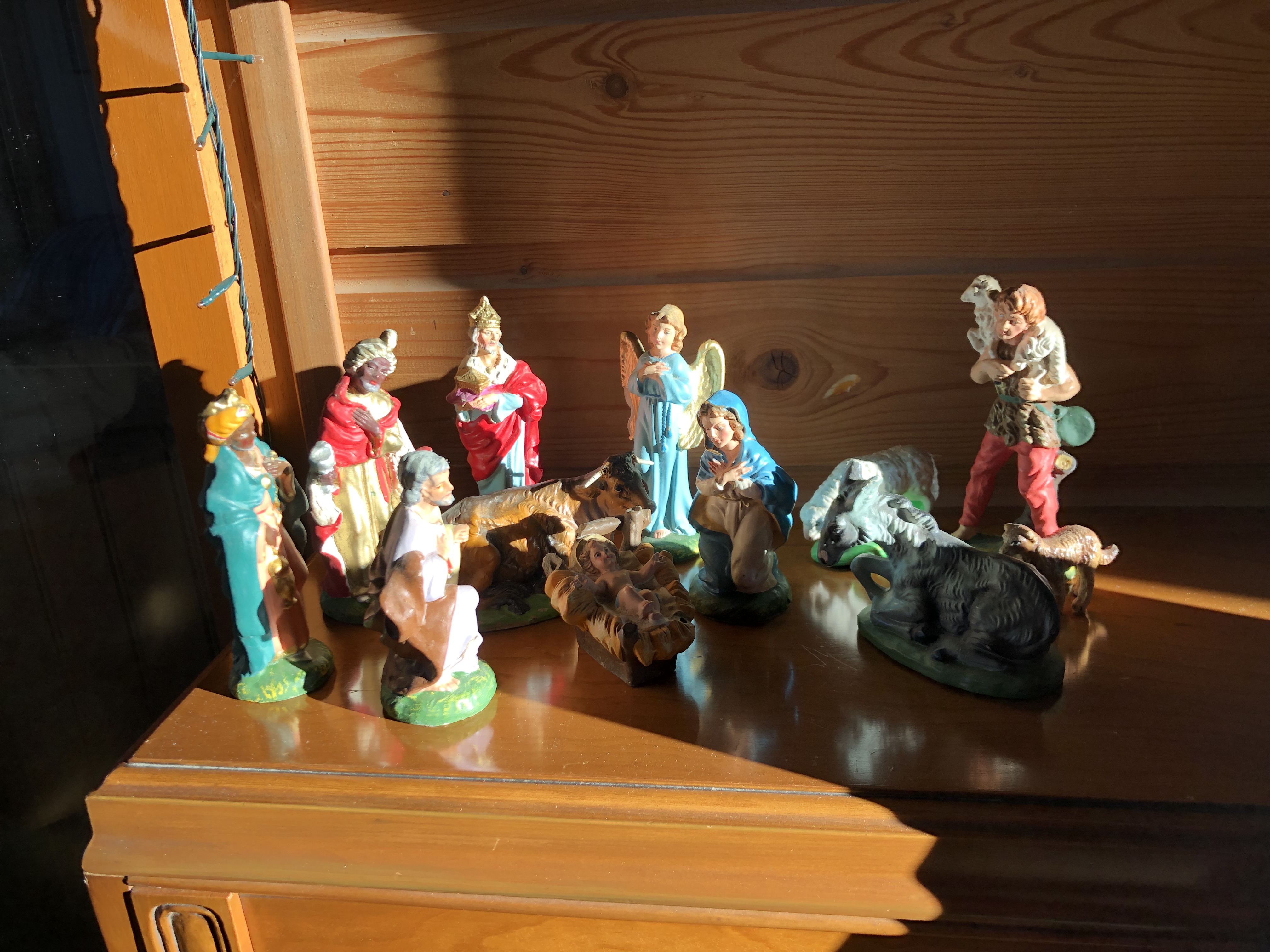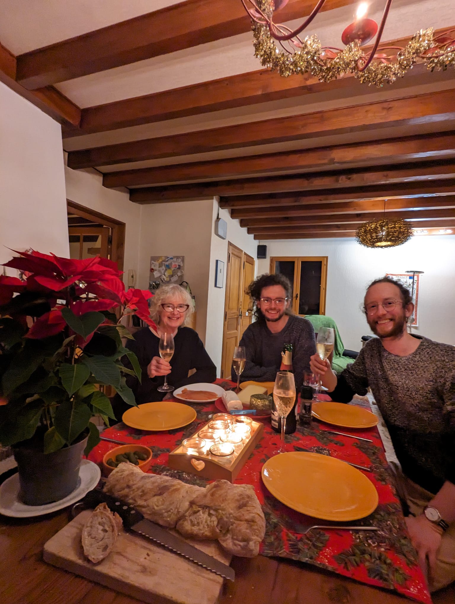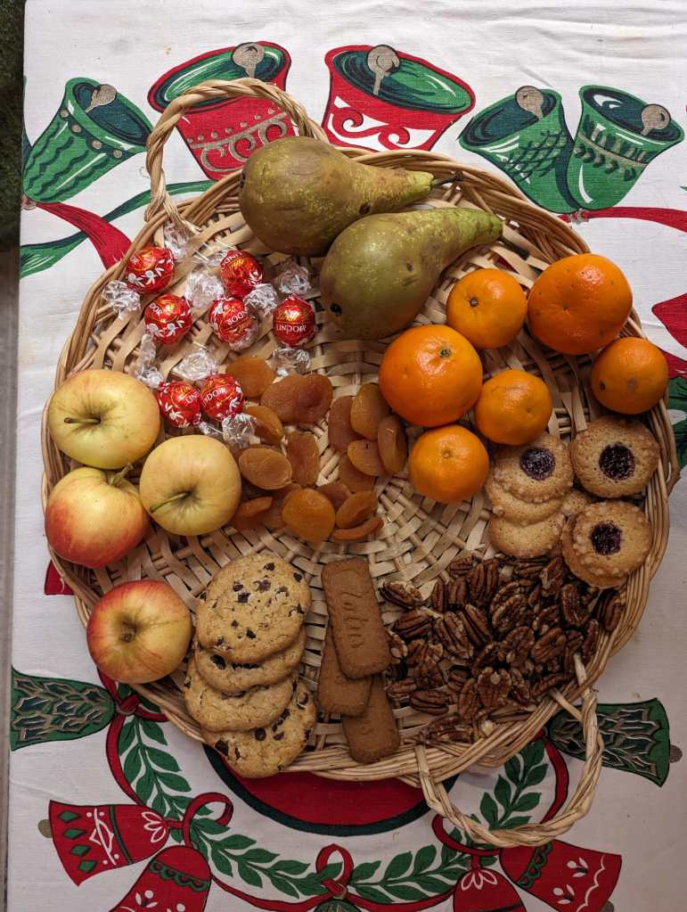 Our Christmas celebration this year was a wonderful mix of old and new. One of the things that was new was that we had a very special guest we’ve not had with us before on Christmas Eve. My son’s partner, Diane, joined us for Christmas Eve this year, which is for me a very special, even sacred, holiday. And she shared with us a very special tradition from her family, which you see pictured above. When we arrived back from getting a last-minute Christmas tree, she had prepared a 13 desserts-de-Provence array, a tradition passed down in her mother’s Provencal family. We didn’t have 13 different sweets in the house, but Diane managed to gather 10 and arrange them on this pretty wicker platter. The festive tablecloth is one of many things that had been kept in captivity for eight years (!) in a storage locker in Maryland. I was very happy to be able to release the contents of that locker this summer with the help of one of my sons, who was good enough to spend part of his summer vacation helping me with this far-from-fun task. What a great guy!!!