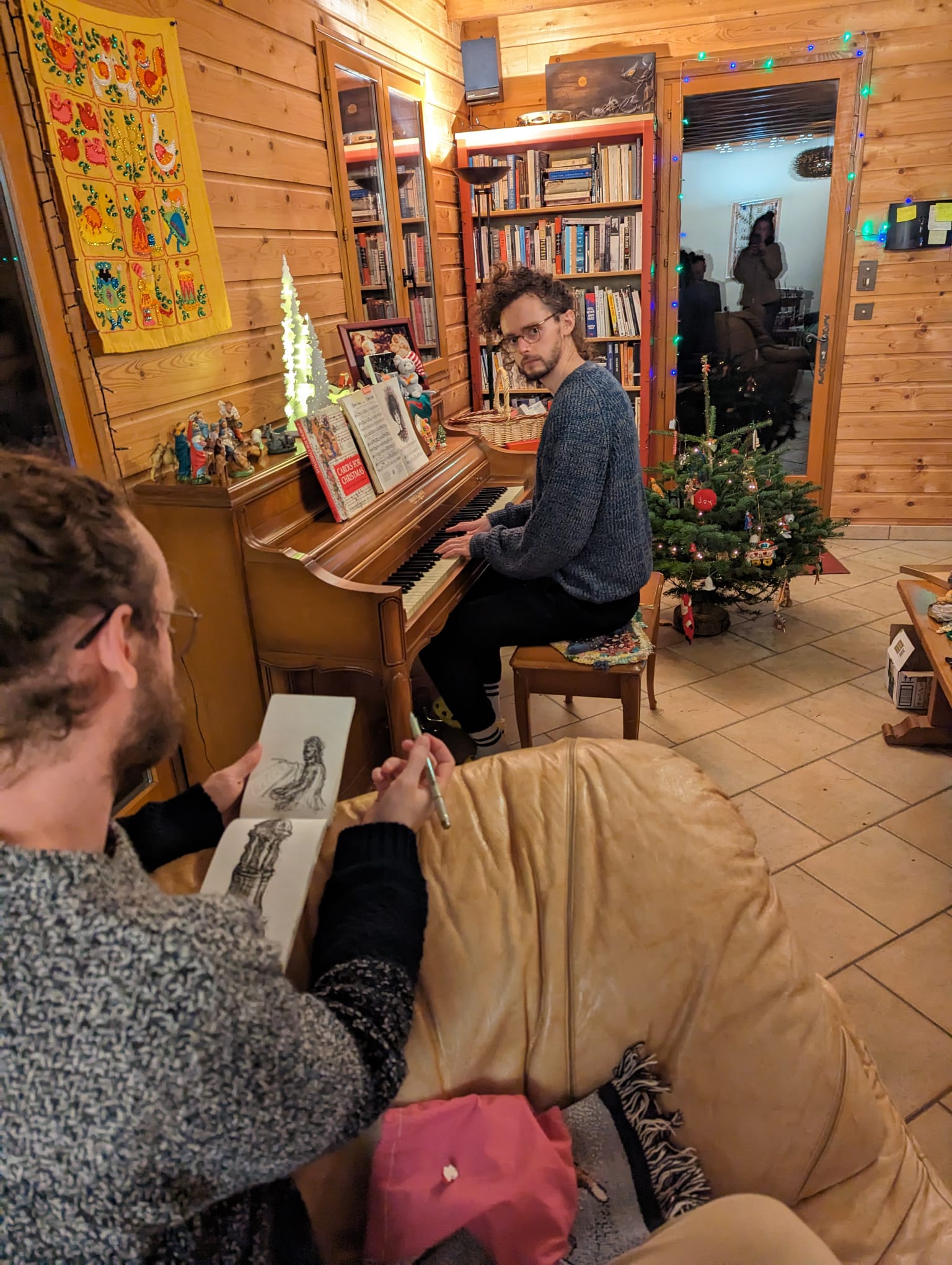 I like to go to Christmas Eve church services when I can, and my sons are very good about going along with me, even though it’s not really important to them. However, this year, due to their busy schedules, we only had about 36 hours when we were all together. So even though they offered to go to mass with me, I said I preferred to stay home this time and just enjoy being together. We had so much to do in such a short time! We had to have special Christmas treats (smoked salmon, Swedish meatballs, champagne, bĂ»che de Nöel); Diane needed to call her (French) family, who were gathered in New York; and we even got in a couple of rockin’ Christmas tunes, with me on piano, Sam on guitar, Phineas on tambourine.