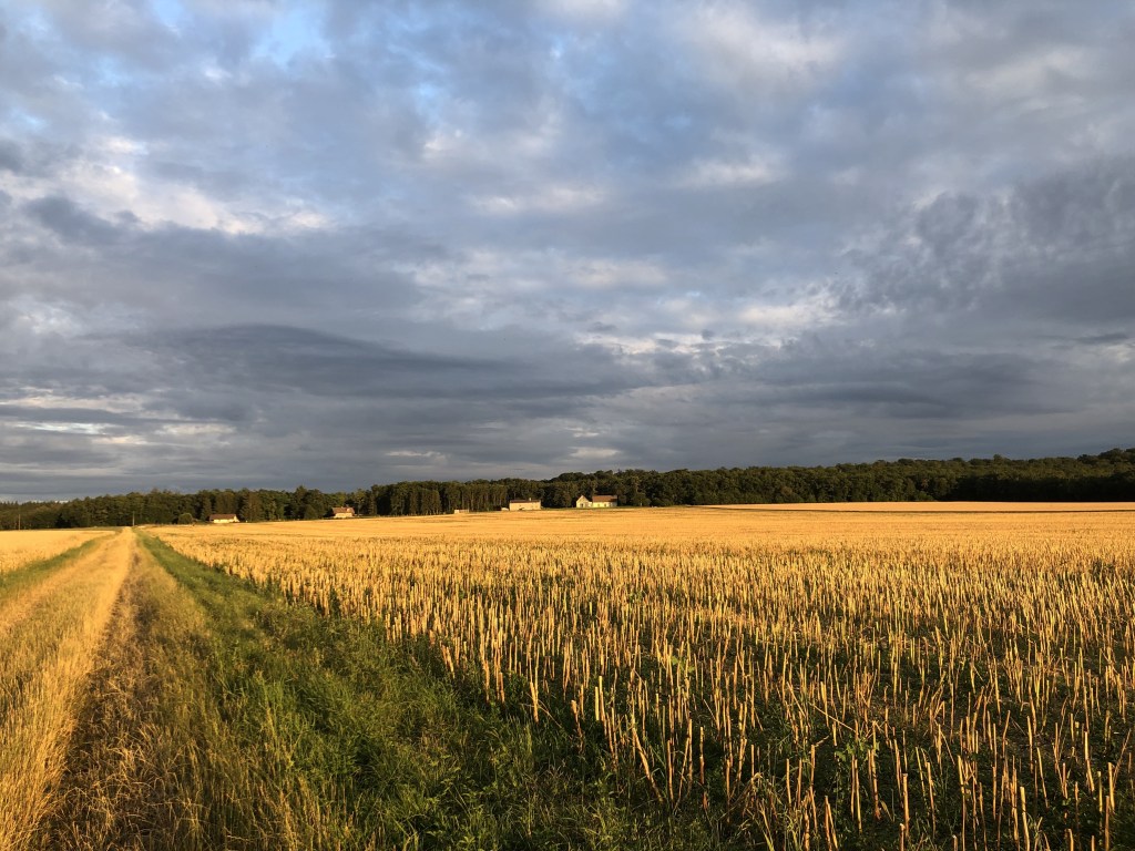 Meanwhile, some things go on pretty much the same from year to year, when the gods (of weather, war, etc) are smiling on us. The farmers plant winter wheat in the fall, and harvest it the next summer. The vignerons tend to their crop all year long, and harvest the grapes in the late summer/early fall. It has been quietly busy here with the grain harvests (colza, wheat) nearing completion, and another one (grapes) soon to begin. Through all this drama in the world at large and in our home I’ve been enjoying watching the farmer harvest his crops in the fields next to our house, as he does every year; and the sound of the enjambeurs heading into the vineyards in the early mornings.