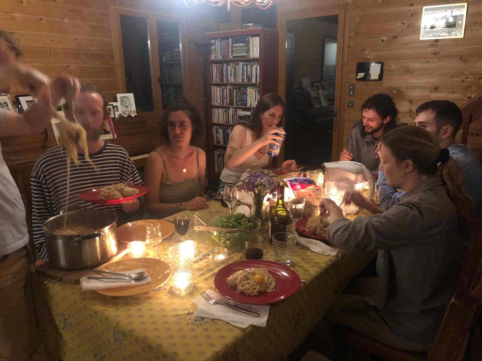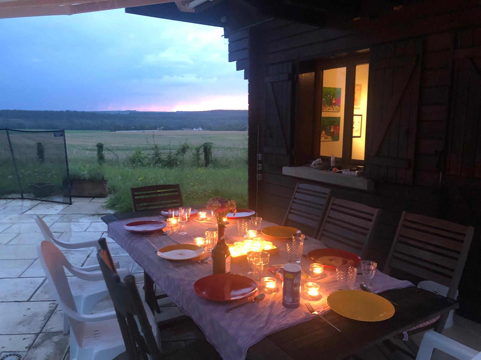 Here we switch the stage for a moment to a much more limited venue: our home in Essoyes, where on July 20 we had a wonderful birthday celebration for one of my sons. It was a beautiful evening (except for the storm that chased us all inside when we had planned to eat on the terrace; but actually the storm was quite beautiful also, just a bit wet. As storms tend to be.)