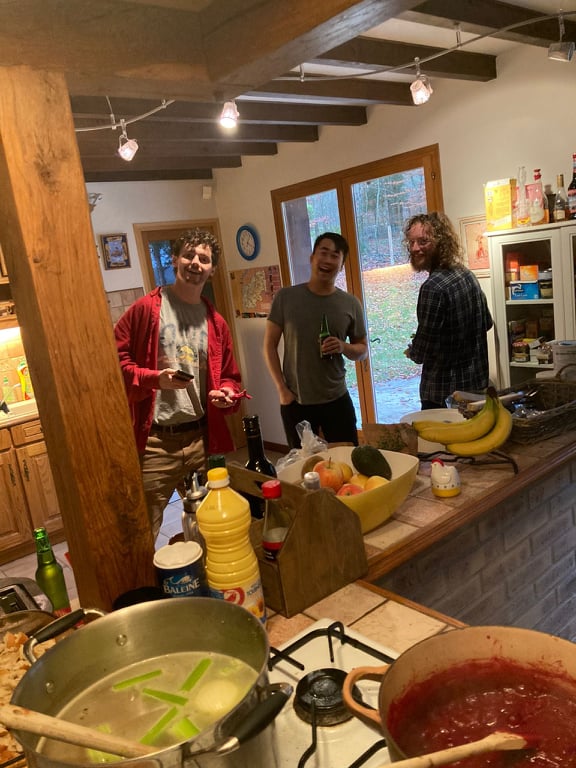 What was the same this year was the joy of bringing together a mix of people to celebrate a holiday we all cherish. This time we were lucky to have among our guests Phineas’s (French) girlfriend; a college friend of his who now lives in London; and the one other American who lives in Essoyes, who came with her two daughters, one of whom is just a toddler, and who delighted us all with her antics.